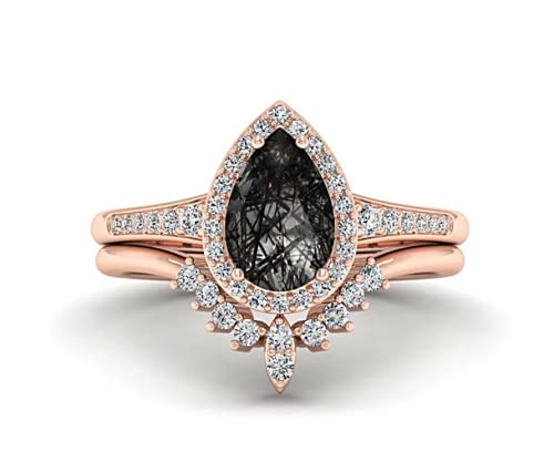 Amazon Com Pear Shape Black Rutilated Quartz Ring Rose Gold Vintage Engagement Ring Set Silver Unique Wedding Ring Bridal Anniversary Black Stone Ring Handmade Products